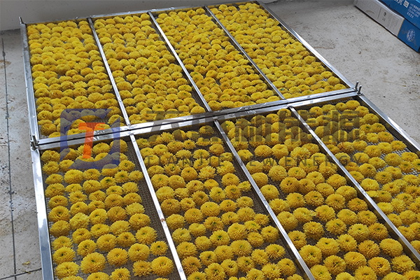 裝房過程中:將采摘好的菊花進(jìn)行挑揀,選擇花型一致,顏色統(tǒng)一的鮮菊花,均勻擺放在托盤上,如果對花型有要求嚴(yán)格的話,則建議在擺放時不要重疊,隨后放置在推車上,推進(jìn)菊花烘干機(jī)內(nèi)。