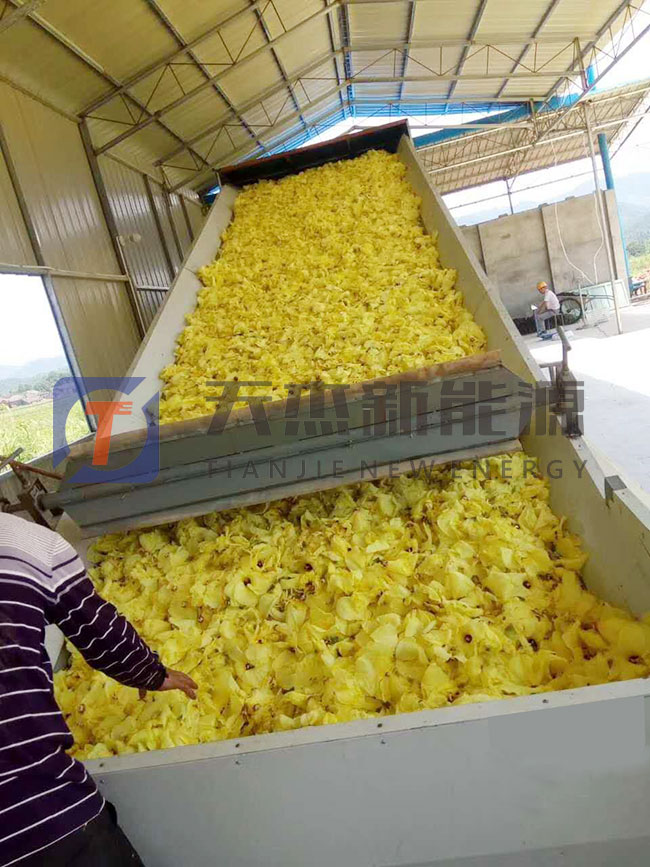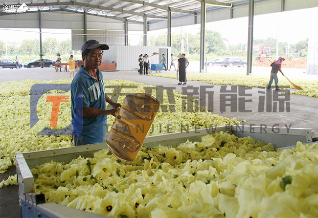 黃蜀葵采摘后,前期挑選處理完裝入黃蜀葵烘干設(shè)備的烘干托盤里,開放的不同程度的黃蜀葵建議分開放置,為保證原有顏色,花苞與花朵建議分批次烘干。然后將物料盤放進(jìn)物料車,一般14P的黃蜀葵烘干機(jī)可以放入物料車8臺(tái),每臺(tái)裝150斤鮮物料。
