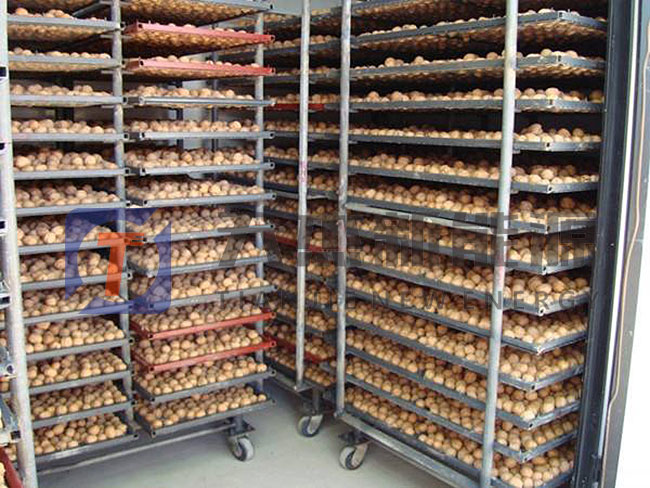 脫青皮后,8小時內(nèi)使用核桃烘干機排濕烘干,排濕溫度 30-35 ℃,烘烤時間 12-15小時,果殼表面水分散失,顏色由黑褐轉(zhuǎn)為褐色時排濕結(jié)束。