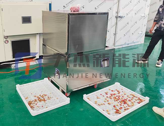2、護色處理,一般多用0.5%異維生素C溶液浸泡10-15分鐘,防止果片變色并盡快瀝干水分,均勻放入山楂烘干機設(shè)備物料車內(nèi),注意平鋪厚度不宜過厚。