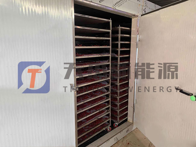黑龍江五味子烘干機客戶現(xiàn)場成品預(yù)覽:將準備烘干的五味子平鋪在烘盤中推入五味子烘干機