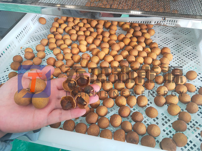天杰新能源?;葜蔟堁酆娓蓹C(jī)開(kāi)機(jī)大吉 將清理好的新鮮龍眼放入托盤送入 龍眼烘干機(jī) 內(nèi) 設(shè)置好小型家用龍眼烘干機(jī)的烘干參數(shù)開(kāi)始進(jìn)行烘干 被龍眼烘干機(jī)加工后的成品展示